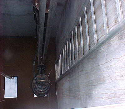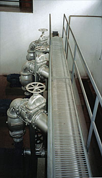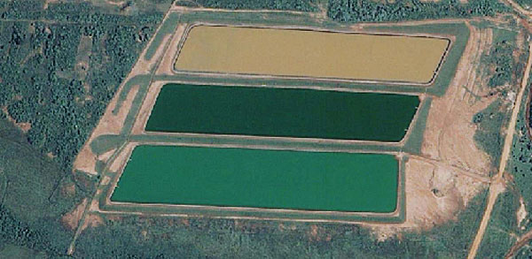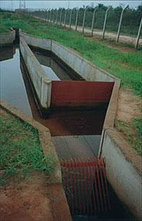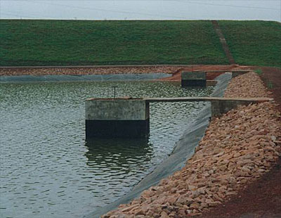 Abwasserreinigung: Zulaufrechen(l), Teichkläranlage, Auslaufbauwerk (r)
