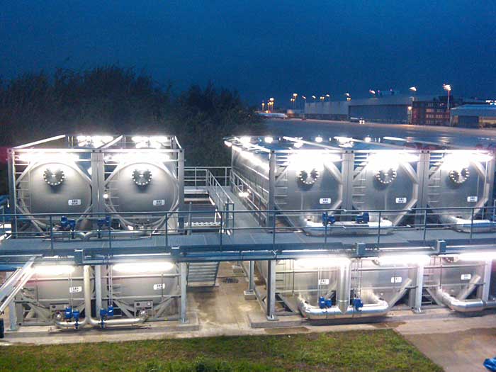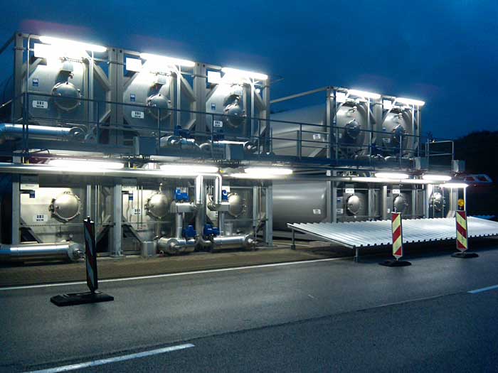 Die Im Zuge der Entwurfs-und Ausführungsplanung wurde ein 3D Datenmodell der gesamten Anlage erstellt, aus dem sämtliche Zeichnungen, Isometrien und Rohrleitungs- und Instrumentenfließbilder (R+I) generiert wurden. Die Behälter wurden als Tankcontainer ausgeführt und mit allen Anschlüssen vorgefertigt und gedämmt auf die Baustelle geliefert. An nur zwei Vormittagen konnten alle 11 Tanks mit einem Autokran aufgestellt werden.